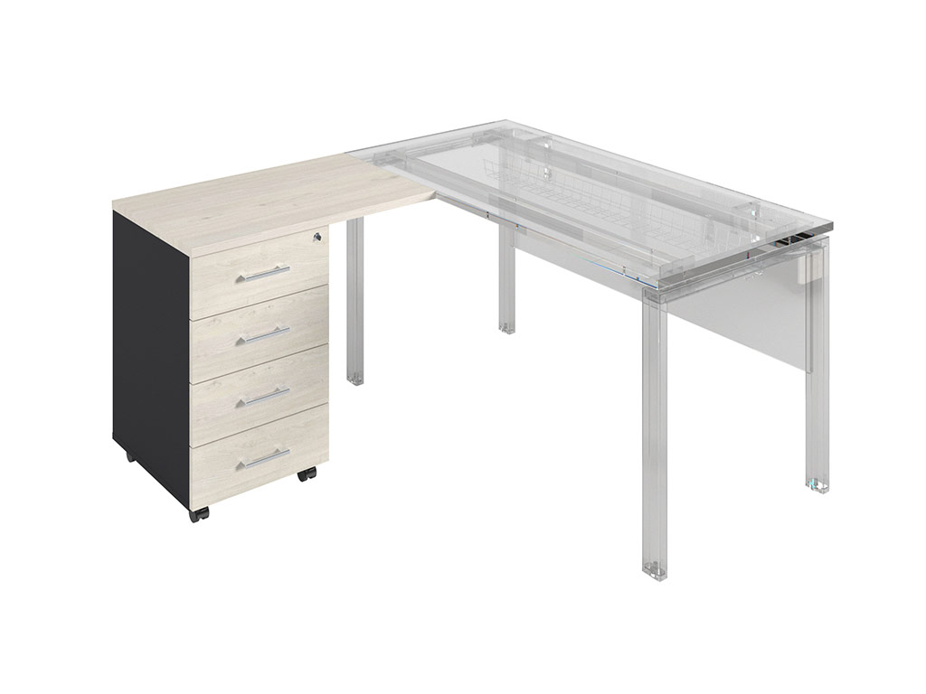 • тумба снабжена центральным замком и оснащена пластмассовым лотком для канцелярских принадлежностей в верхнем ящике